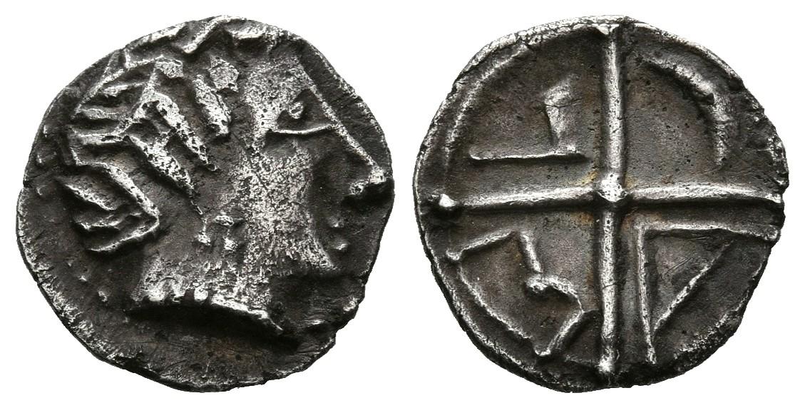 DIVISORES DE IMITACION DE MASSALIA. Trietartemorion. (Ar. 0,46g/9mm). 200-110 a.C. (FAB-1187). Anv: Cabeza femenina a derecha. Rev: Rueda de cuatro radios, dentro de ellos hacha, creciente, A y M. MBC.