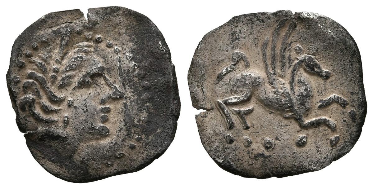EMPORION (Ampurias, Gerona). Hemitrietartemorion. (Ar. 0,39g/12mm). 200-110 a.C. (FAB-1196). Anv: Cabeza femenina con tocado a derecha. Rev: Pegaso a derecha, debajo dos roeles. MBC.