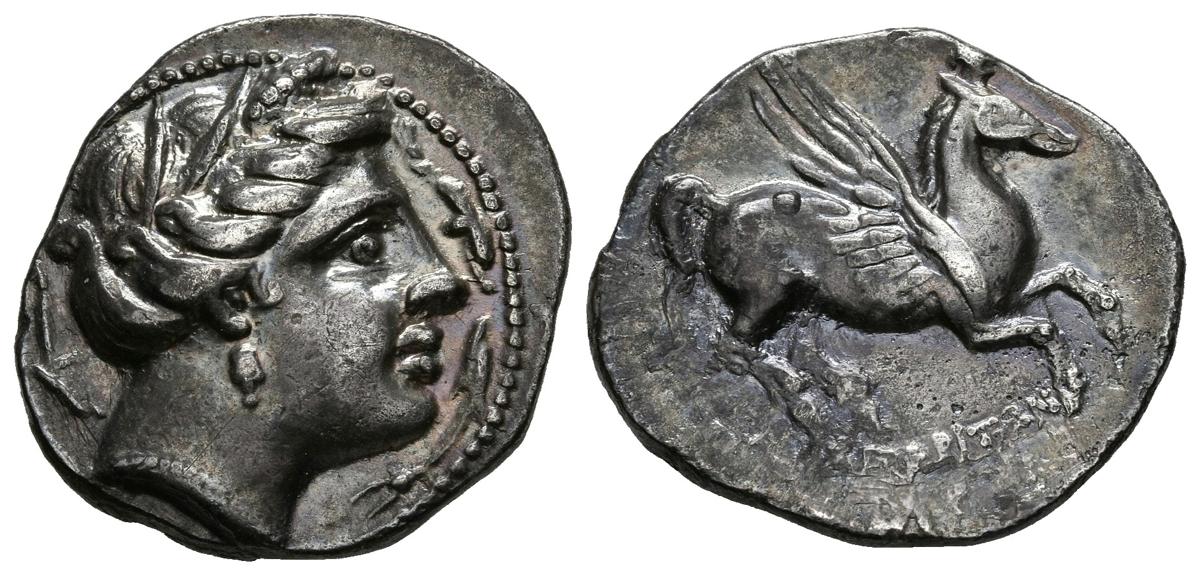 EMPORION (Ampurias, Gerona). Dracma. (Ar. 4,62g/21mm). 220-150 a.C. (FAB-1101). Anv: Cabeza femenina a derecha, alrededor tres delfines. Rev: Pegaso a derecha, debajo leyenda griega curva. MBC+. Bonita pátina.