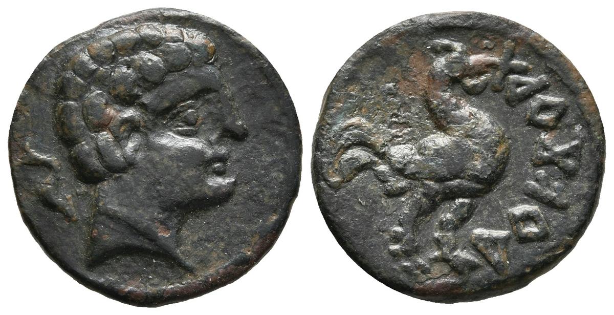 ARECORATAS (Agreda, Soria). Semis. (Ae. 3,55g/19mm). 150-20 a.C. (FAB-92). Anv: Cabeza masculina a derecha, detrás delfín. Rev: Gallo a derecha, delante leyenda: ARECoRATaS. MBC+. Muy escaso y más así.