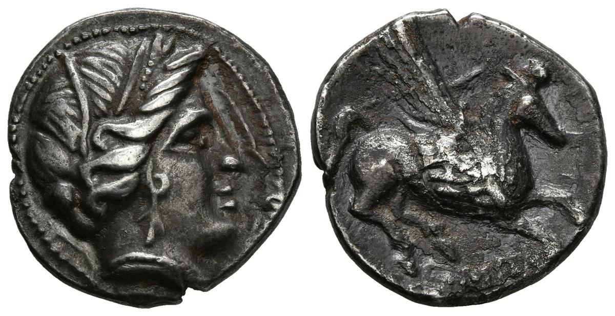 EMPORION (Ampurias, Gerona). Dracma. (Ar. 4,61g/18mm). 220-150 a.C. (FAB-1108). Anv: Cabeza femenina a derecha, alrededor tres delfines. Rev: Pegaso a derecha, debajo leyenda griega curva. MBC+. Escaso.