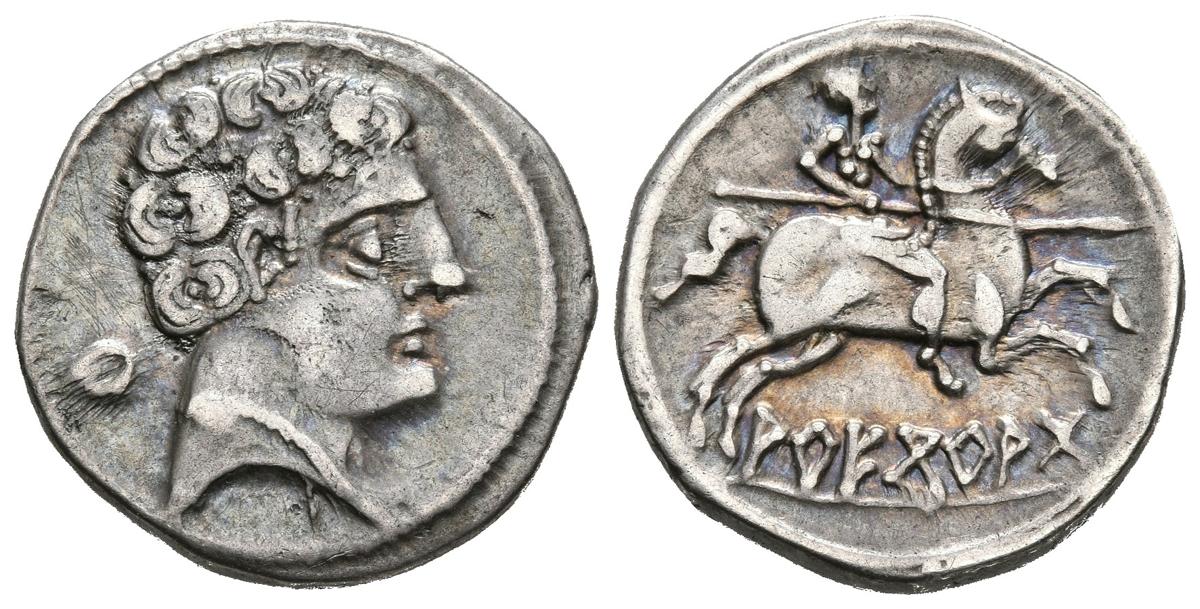 ARECORATAS (Agreda, Soria). Denario. (Ar. 3,90g/19mm). 150-20 a.C. (FAB-105). Anv: Cabeza masculina a derecha, detrás leyenda ibérica: Cu. Rev: Jinete con lanza a derecha, debajo leyenda ibérica sobre línea: ARECoRATa. MBC.