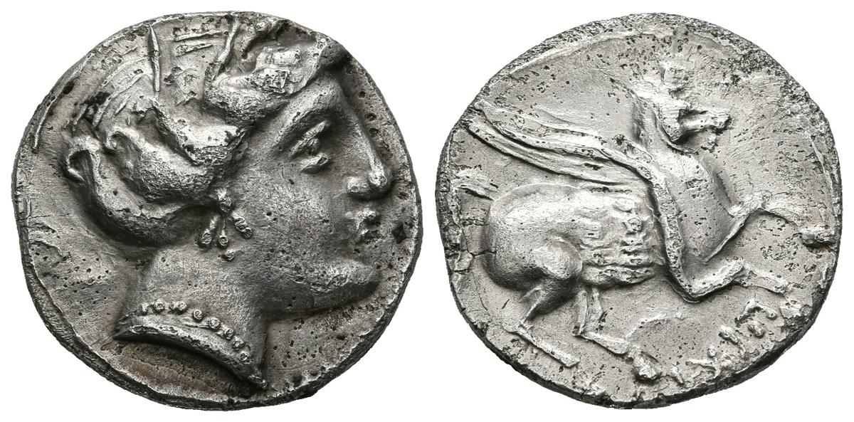 EMPORION (Ampurias, Gerona). Dracma. (Ar. 4,19g/18mm). 220-150 a.C. (FAB no cita). Anv: Cabeza femenina a derecha. Rev: Pegaso a derecha, debajo leyenda griega curva. MBC+. Escaso.