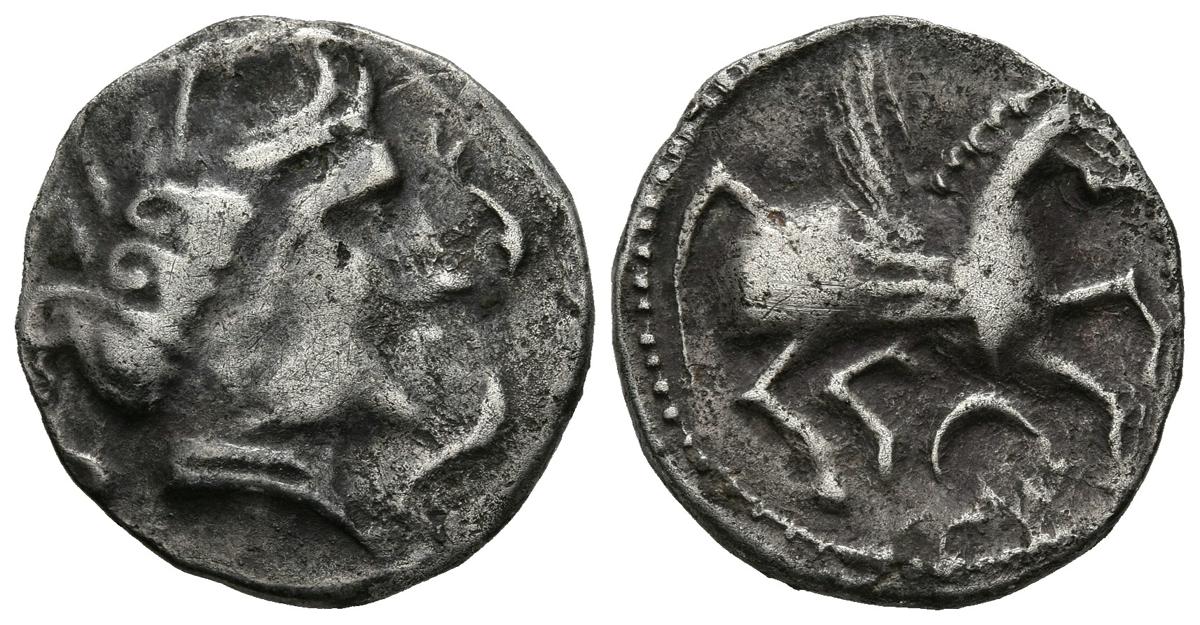 EMPORION (Ampurias, Gerona). Dracma. (Ar. 4,72g/19mm). 220-150 a.C. (FAB no cita). Anv: Cabeza femenina a derecha. Rev: Pegaso a derecha, debajo creciente y leyenda griega curva. MBC-. Escaso.
