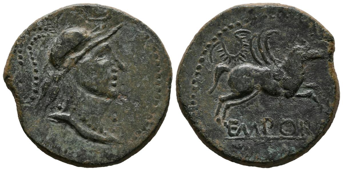 EMPORION (Ampurias, Gerona). As. (Ae. 9,42g/27mm). 50-27 a.C. (FAB-1246). Anv: Cabeza de Palas a derecha. Rev: Pegaso a derecha, encima láurea, debajo leyenda sobre línea: EMPORIT. MBC.