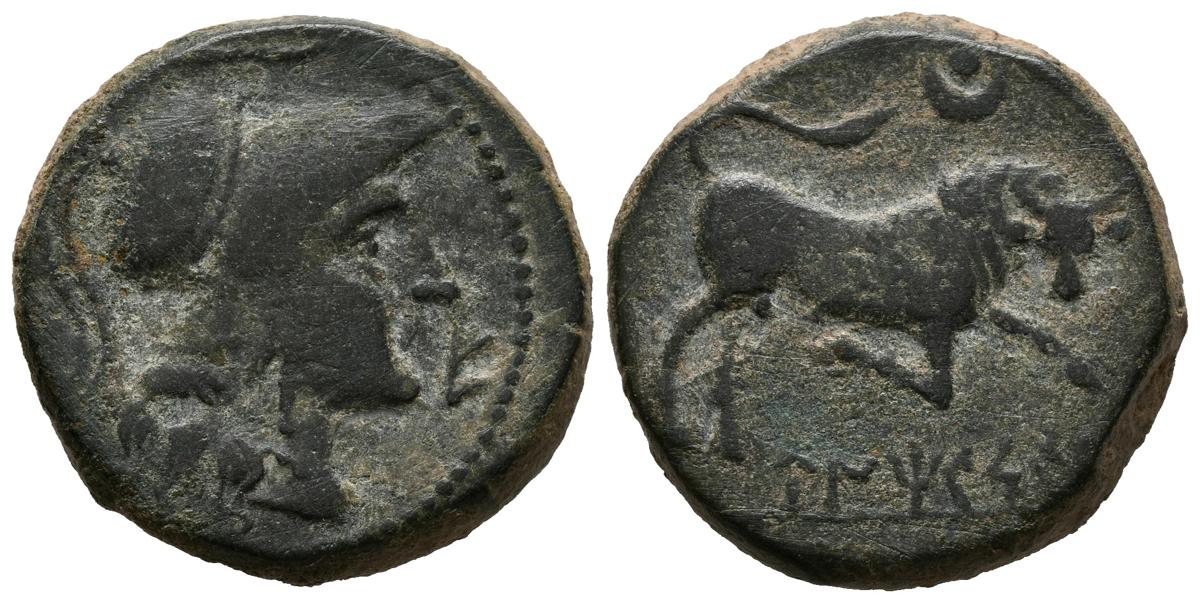 UNTICESCEN (Sant Martí d'Empuries, Gerona). Semis. (Ae. 6,17g/21mm). 130-90 a.C. (FAB-1220). Anv: Cabeza de Palas a derecha, delante letra ibérica E. Rev: Toro embistiendo a derecha, encima creciente con punto, debajo leyenda ibérica sobre línea: UNTiCeSCeN. MBC-.