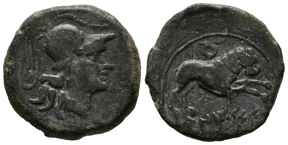 UNTICESCEN (Sant Martí d'Empuries, Gerona). Semis. (Ae. 6,17g/21mm). 130-90 a.C. (FAB-1222 var). Anv: Cabeza de Palas a derecha. Rev: Toro embistiendo a derecha, encima láurea, debajo leyenda ibérica sobre línea: UNTiCeSCeN. MBC-.