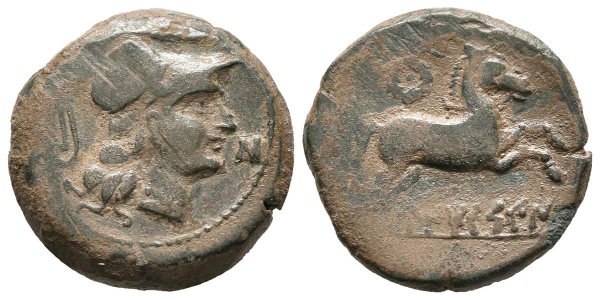 UNTICESCEN (Ampurias, Gerona). Sextante. (Ae. 4,60g/18mm). 130-90 a.C. (FAB-1234). Anv: Cabeza de Palas a derecha, delante letra ibérica: S. Rev: Caballo saltando a derecha, encima láurea, debajo leyenda ibérica sobre línea: UNTiCeSCeN. MBC+.