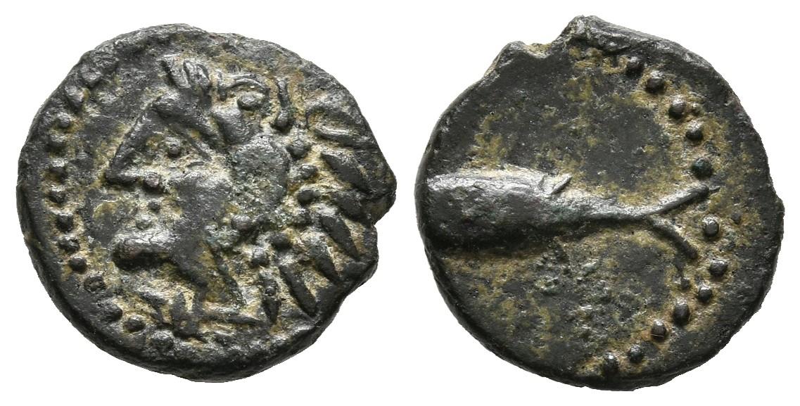 GADES (Cádiz). 1/8 Calco. (Ae. 1,09g/12mm). 200-100 a.C. (FAB-1323). Anv: Cabeza de Melkart a izquierda con piel de león. Rev: Atún a izquierda. MBC.