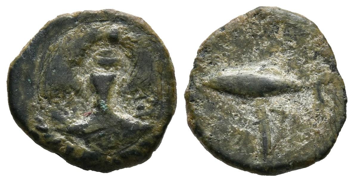 GADES (Cádiz). 1/8 Calco. (Ae. 0,93g/12mm). 300-200 a.C. (FAB-1335). Anv: Cabeza de frente. Rev: Atún a izquierda, debajo letra Alef. MBC-.