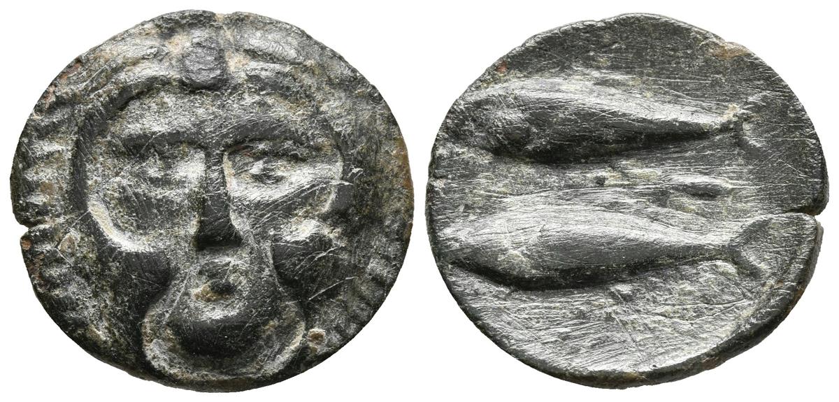 GADES (Cádiz). Calco. (Ae. 3,94g/20mm).200-100 a.C. (FAB-1336). Anv: Cabeza de Melkart de frente con piel de león. Rev: Dos atunes a izquierda, entre ellos, letra Alef. MBC.