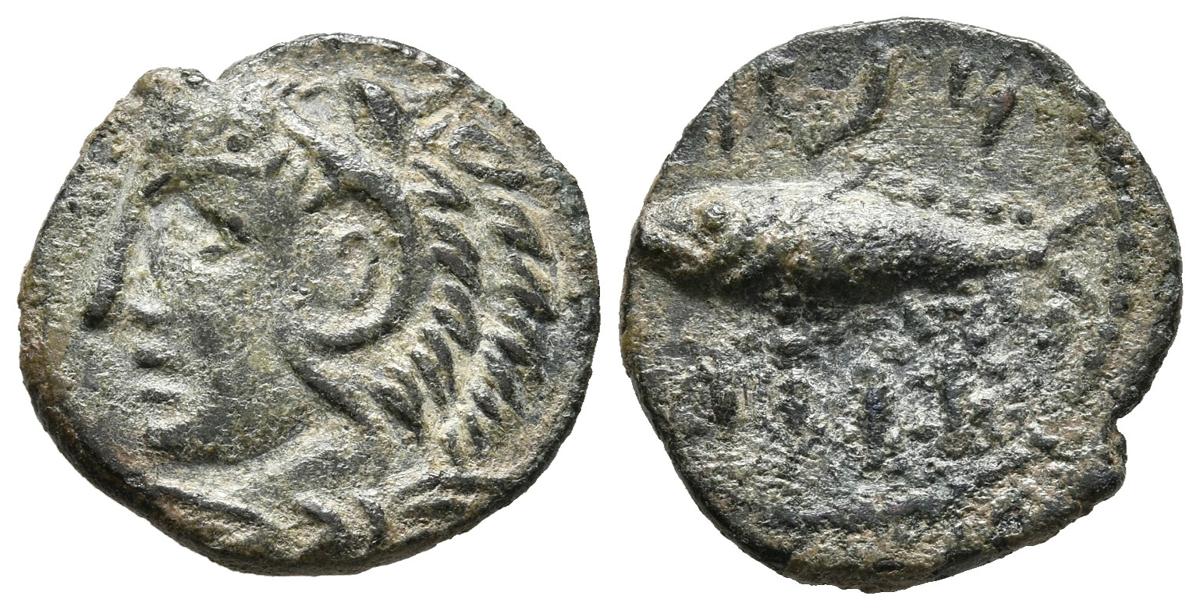 GADES (Cádiz). Semis. (Ae. 1,90g/17mm). 100-20 a.C. (FAB-1346). Anv: Cabeza de Melkart a izquierda con piel de león. Rev: Atún a izquierda entre leyenda púnica tipo B. MBC+.