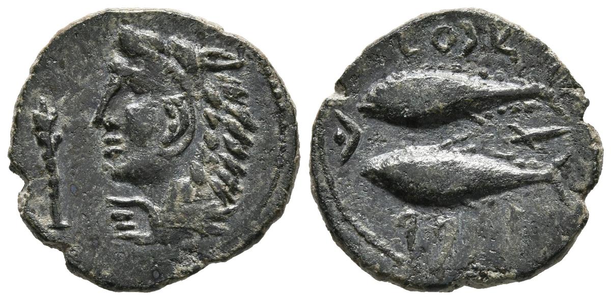 GADES (Cádiz). Semis. (Ae. 2,66g/18mm). 100-20 a.C. (FAB-1347). Anv: Cabeza de Melkart a izquierda con piel de león, delante clava. Rev: Dos atunes a izquierda entre leyenda púnica tipo B, entre ellos, creciente con punto y letra Alef. MBC+. Bonito ejemplar.