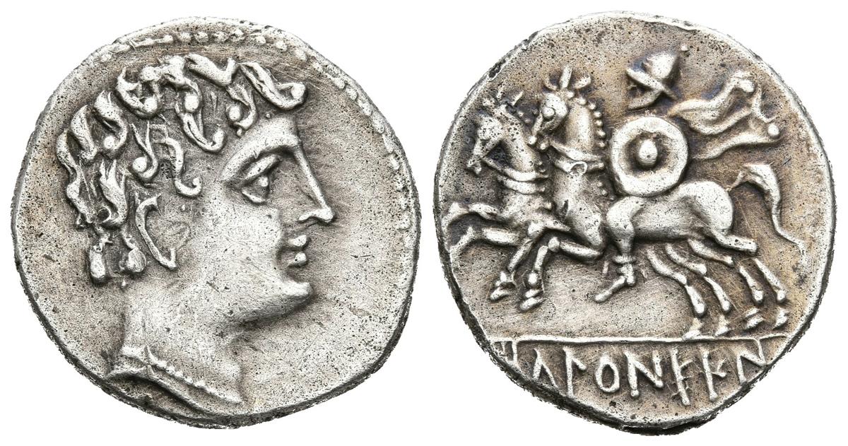 ICALSCUNSCEN (Iniesta, Cuenca). Denario. (Ar. 3,48g/20mm). 120-20 a.C. (FAB-1402). Anv: Cabeza masculina a derecha. Rev: Jinete con rodela y clámide a izquierda con un segundo caballo, debajo leyenda ibérica: ICaLCuNSCeN. MBC+.