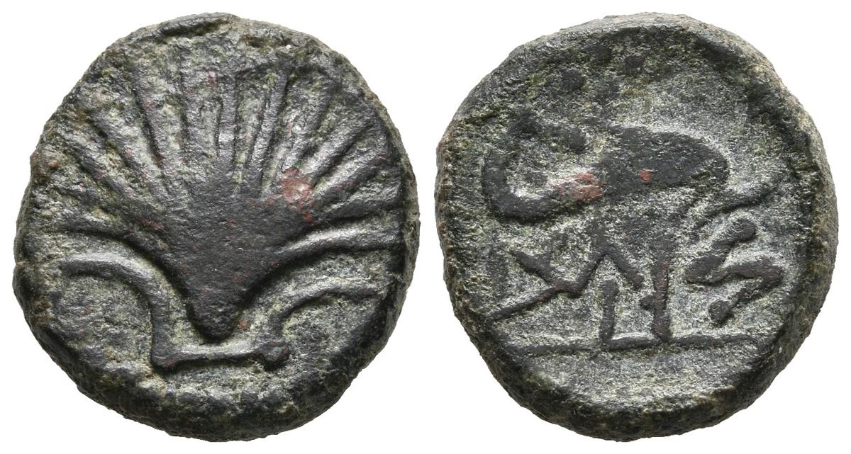 ARSE-SAGUNTO (Sagunto, Valencia). Cuadrante. (Ae. 4,15g/17mm). 170-20 a.C. (FAB-2051). Anv: Concha. Rev: Delfín a derecha, encima tres puntos, debajo leyenda sobre línea: AIUBaS. MBC.