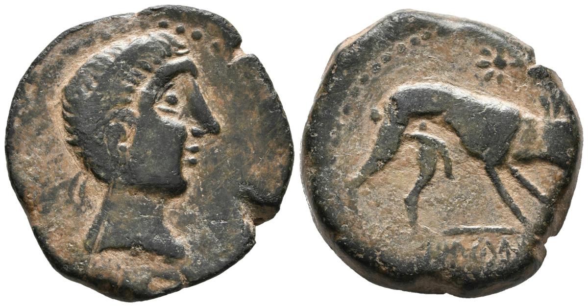 ILTERACA (Iliturgi). As. (Ae. 18,96g/30mm). 80-20 a.C. (FAB-1565). Anv: Cabeza masculina diademada a derecha. Rev: Lobo a derecha, encima estrella, debajo leyenda ibérica: ILTeRaCa. MBC. Escaso.