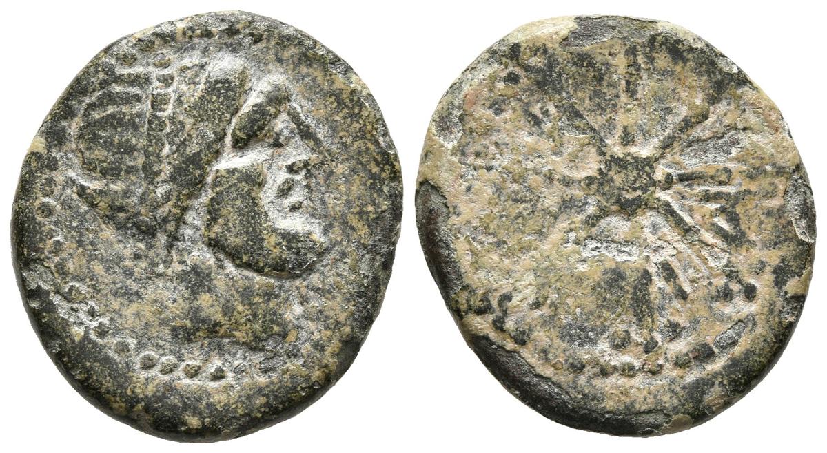 IPTUCI (Prado del Rey, Cádiz). Semis. (Ae. 4,82g/20mm). 50-20 a.C. (FAB-1573). Anv: Cabeza de Júpiter a derecha. Rev: Rueda de ocho radios, entre ellos leyenda libio-fenicia. MBC.