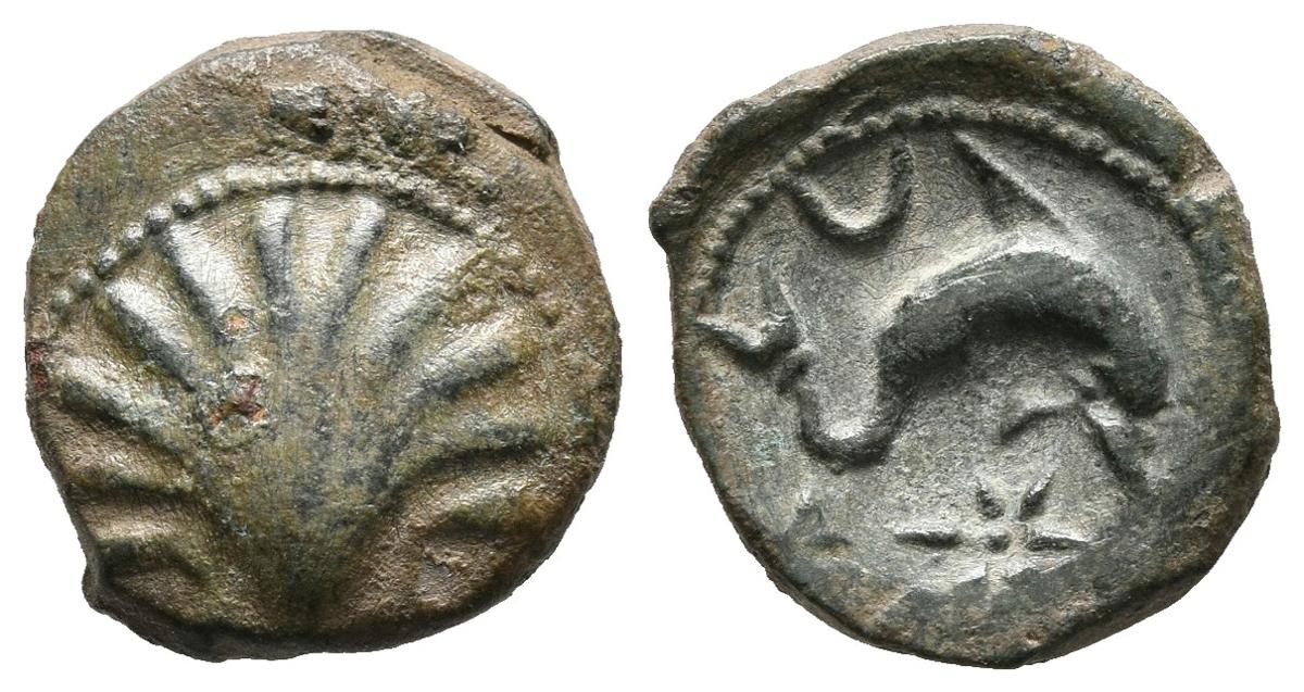 ARSE-SAGUNTO (Sagunto, Valencia). Sextante. (Ae. 1,39g/13mm). 170-20 a.C. (FAB-2064). Anv: Concha. Rev: Delfín a derecha, encima creciente, debajo letra ibérica A y estrella. MBC.