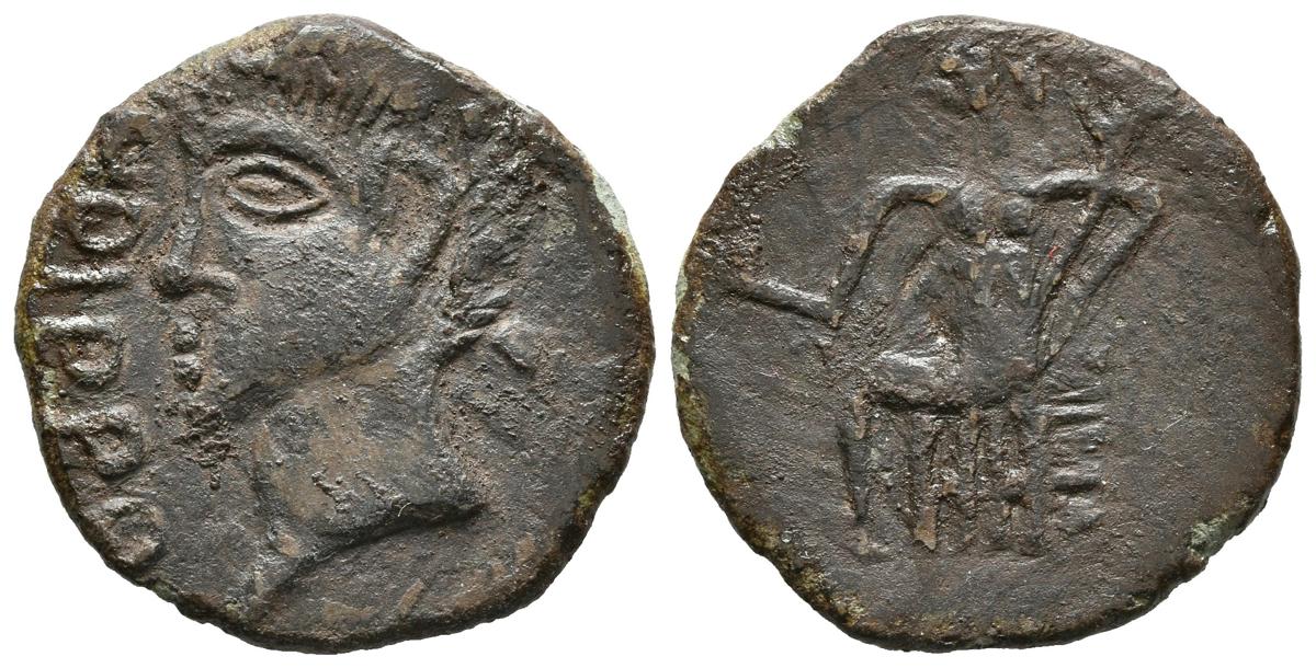 IRIPPO (Zona Sur de Sevilla). As. (Ae. 3,98g/22mm). 30 a.C. (FAB-1582). Anv: Cabeza de Octavio a izquierda, delante leyenda: IRIPPO. Rev: Deida sentada a izquierda con piña y cornucopia. MBC.