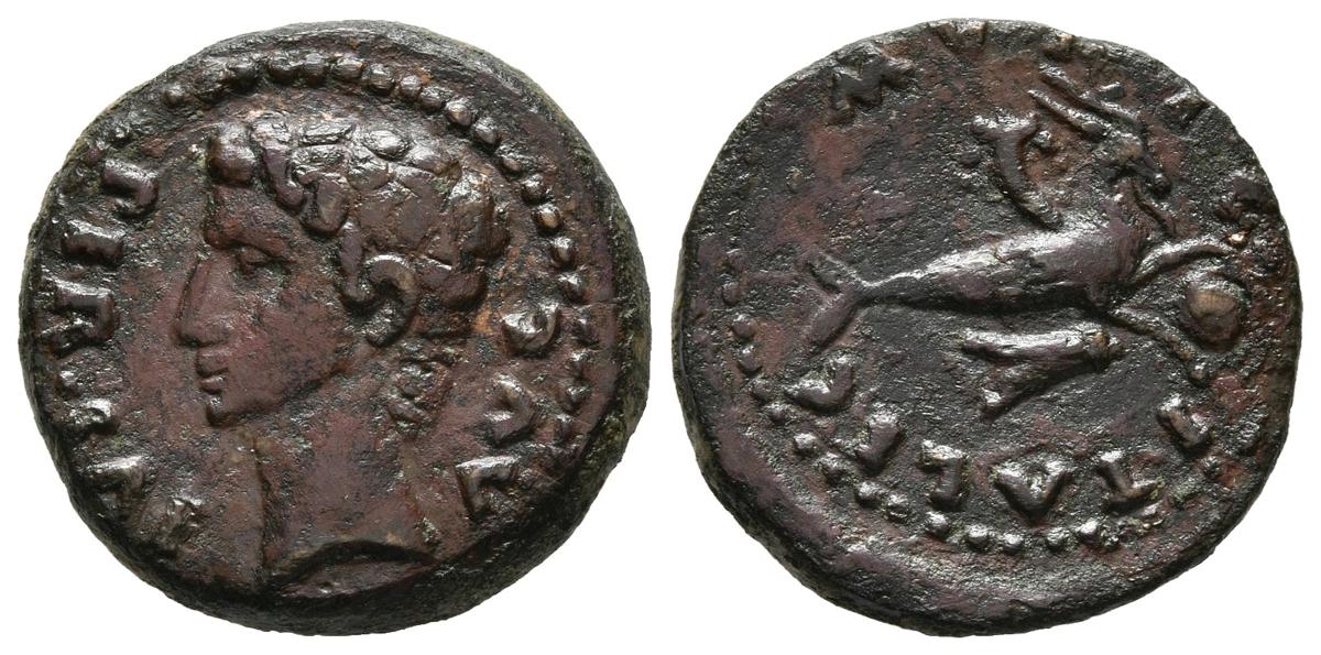 ITALICA (Santiponce, Sevilla). Cuadrante. (Ae. 3,20g/17mm). 27 a.C.-14 d.C. (FAB-1589). Anv: Cabeza de Augusto a izquierda, alrededor leyenda: PER CAE AVG. Rev: Capricornio con globo y timón, alrededor leyenda: MVNIC ITALIC. MBC+. Escaso.
