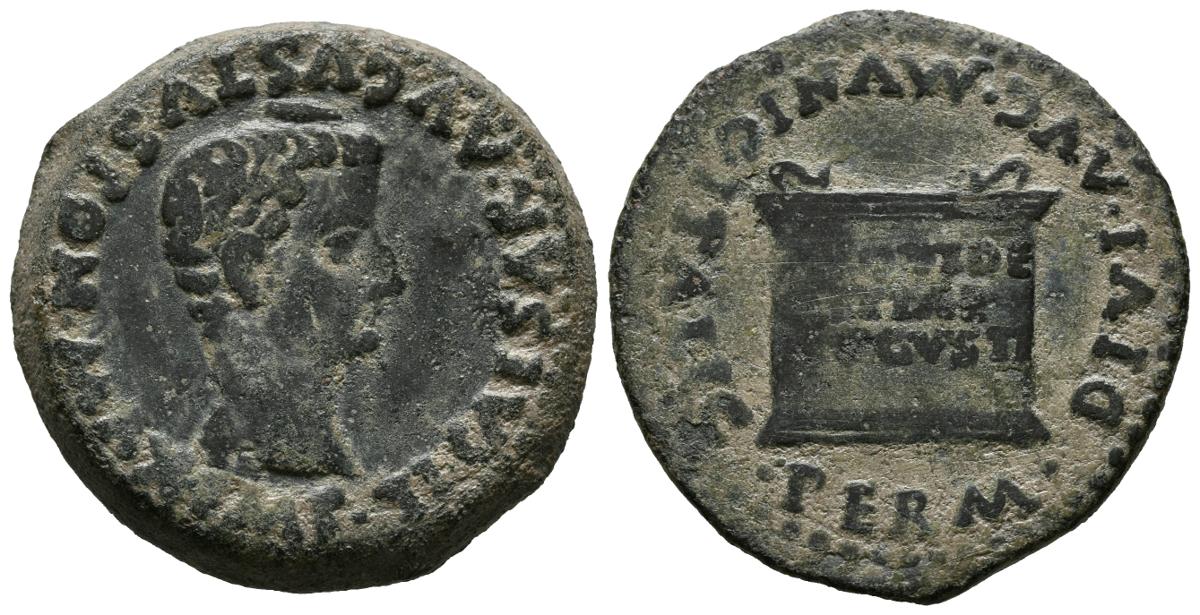 ITALICA (Santiponce, Sevilla). As. (Ae. 12,14g/29mm). 14-36 d.C. (FAB-1593). Anv: Cabeza de Tiberio a derecha, alrededor leyenda: IMP TI CAESAR AVGVSTVS PON MAX. Rev: Ara con leyenda: PROVIDENTIAE AVGVSTI, alrededor leyenda: PERM DIVI AVG MVNIC ITALIC. MBC-.