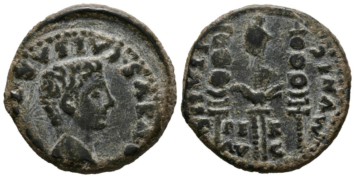 ITALICA (Santiponce, Sevilla). Semis. (Ae. 6,53g/23mm). 14-36 d.C. (FAB-1596). Anv: Cabeza de Druso a izquierda, alrededor leyenda: DRVSVS CAESAR TI AVG F. Rev: Enseñas y águila legionaria, en medio: PERM AVG, alrededor leyenda: MVNIC ITALIC. MBC-.