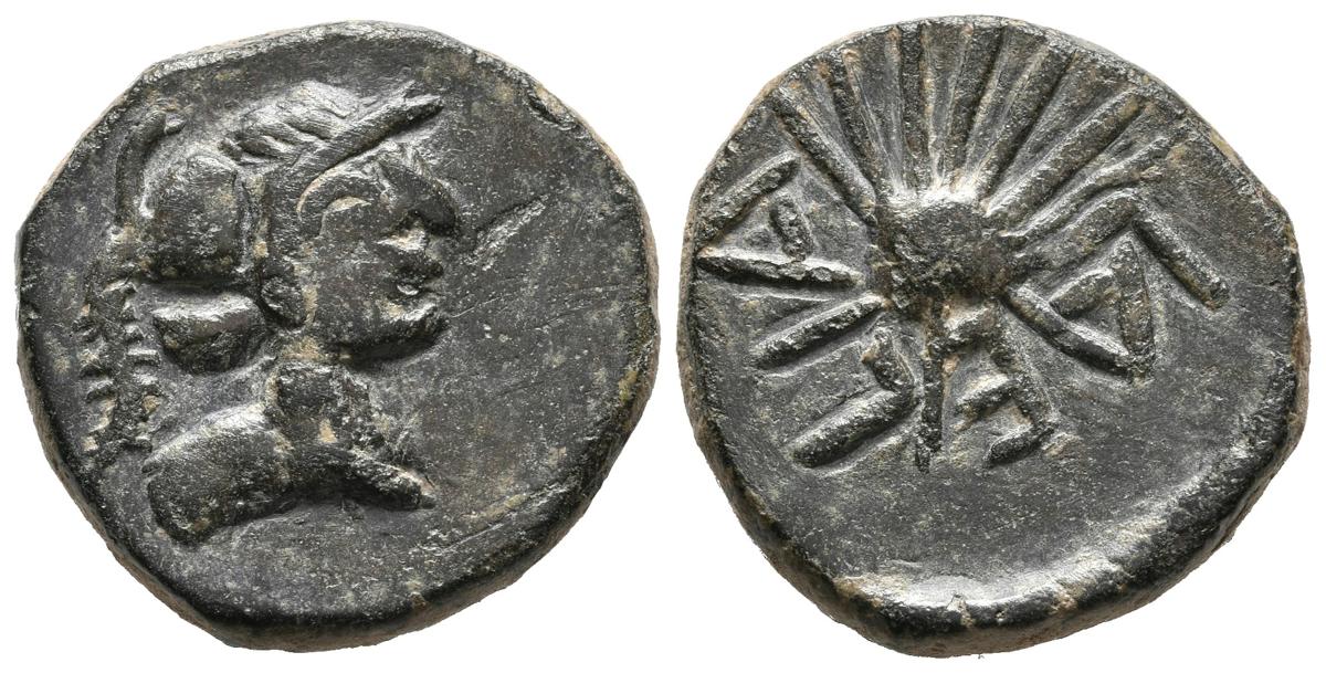 LAELIA (Olivares, Sevilla). Semis. (Ae. 8,18g/21mm). 50-20 a.C. (FAB-1651). Anv: Cabeza con casco a derecha. Rev: Palma, debajo leyenda invertida: LAELIA. MBC.