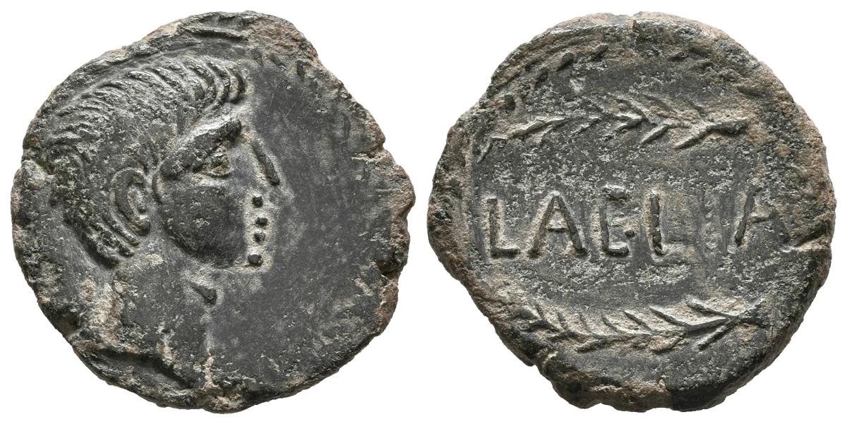 LAELIA (Olivares, Sevilla). Semis. (Ae. 3,44g/19mm). 50-20 a.C. (FAB no cita; ACIP 2369). Anv: Cabeza masculina a derecha. Rev: Dos espigas a izquierda, entre ellas leyenda: LAELIA. MBC+. Escaso.