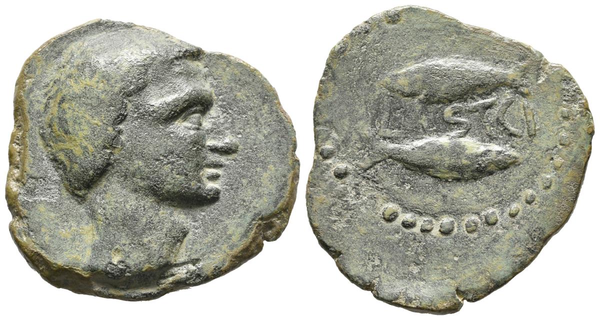 LASTIGI (Cerca de Aznalcóllar, Sevilla). As. (Ae. 10,74g/29mm). 150-50 a.C. (FAB-1676). Anv: Cabeza masculina a derecha. Rev: Dos atunes, uno a derecha, otro a izquierda, entre ellos leyenda: LASTGI. MBC-.