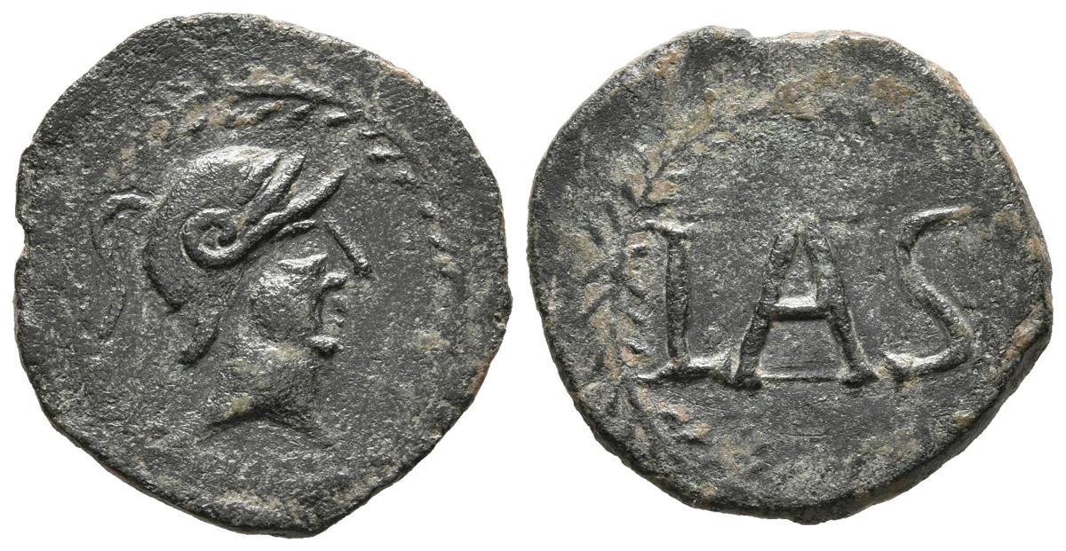 LASTIGI (Cerca de Aznalcóllar, Sevilla). Cuadrante. (Ae. 3,14g/20mm). 150-50 a.C. (FAB-1680). Anv: Cabeza masculina con casco a derecha, dentro de láurea. Rev: Leyenda entre líneas: LAS. MBC.