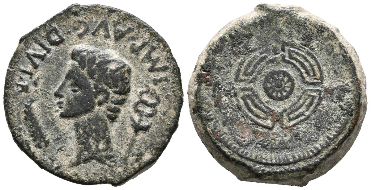 LUCO AUGUSTI (Lugo). As. (Ae. 12,19g/27mm). 27 a.C.-14 d.C. (FAB-1705). Anv: Cabeza de Augusto a izquierda, entre espiga y caduceo, encima leyenda: IMP AVG DIVI F. Rev: Rodela de frente con borde. MBC. Escaso.