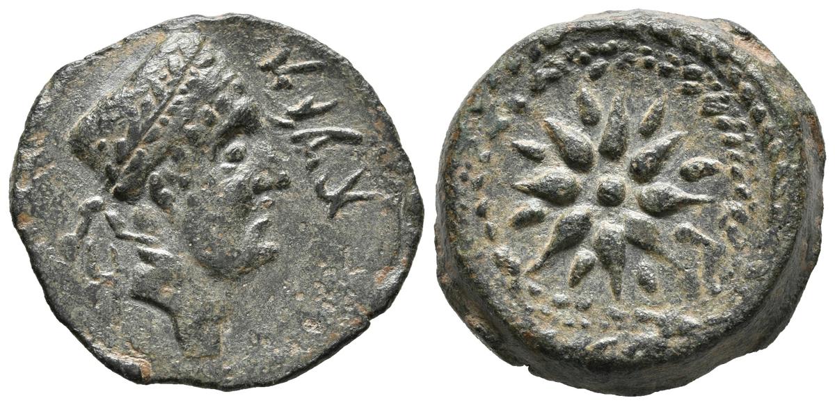 MALACA (Málaga). Semis. (Ae. 7,38g/23mm). 200-20 a.C. (FAB-1734). Anv: Cabeza de Vulcano a derecha, delante leyenda púnica tipo B, detrás tenazas. Rev: Estrella de dieciséis rayos, dentro de láurea. MBC+.