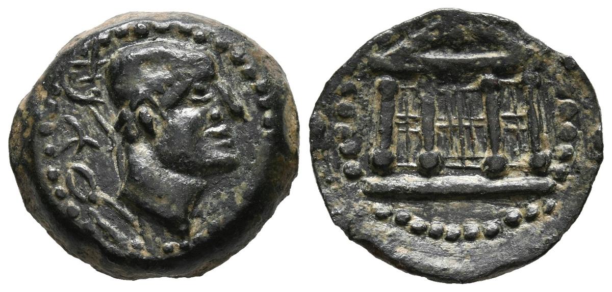 MALACA (Málaga). Semis. (Ae. 3,08g/17mm). 200-20 a.C. (FAB-1737). Anv: Cabeza de Vulcano a derecha, detrás tenazas y leyenda púnica tipo B. Rev: Templo tetrástilo. EBC-. Precioso ejemplar.