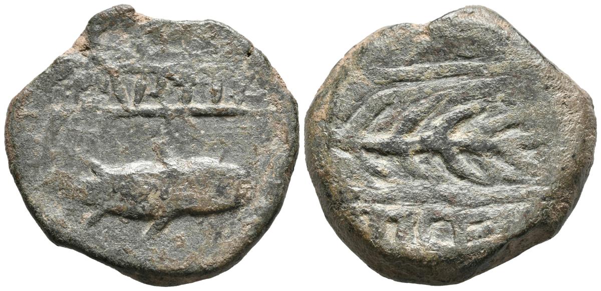 MURTILIS (Mértola, Portugal). Dupondio. (Ae. 26,09g/34mm). 120-50 a.C. (FAB-1757). Anv: Atún a derecha, leyenda entre dos líneas: MVRTIL. Rev: Espiga a derecha, leyenda entre líneas: L ACP. MBC-. Escaso.