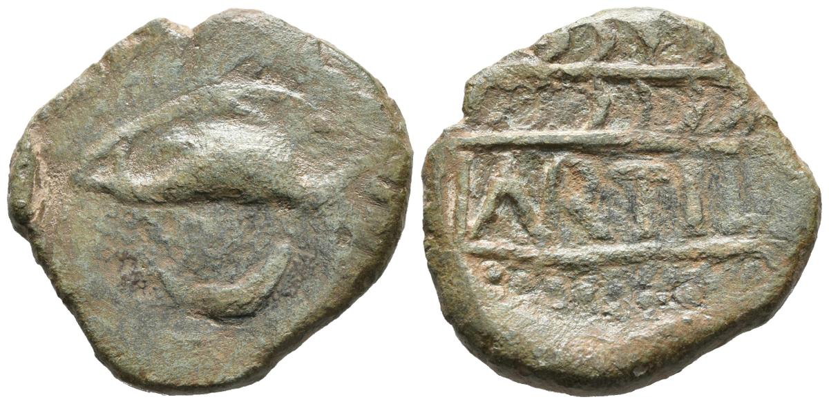 MURTILIS (Mértola, Portugal). As. (Ae. 9,21g/27mm). 120-50 a.C. (FAB-1760). Anv: Delfín a derecha, debajo creciente. Rev: Espiga a derecha, debajo leyenda entre dos líneas: MVRTI. MBC. Muy raro.El hecho de estar situada en una frecuentada ruta que comunicaba el interior con la costa, hace de este enclave un lugar perfectamente referenciado en numerosas fuentes. Se sitúa concretamente en el camino que une Beja, en el Alentejo portugués con la desembocadura del Guadiana y hay estudios que vinculan también, esta ruta, con el tráfico de estaño entre Tartessos y Galicia. Es por lo estratégico del enclave por lo que desde muy temprana edad fue incorporada a Roma.