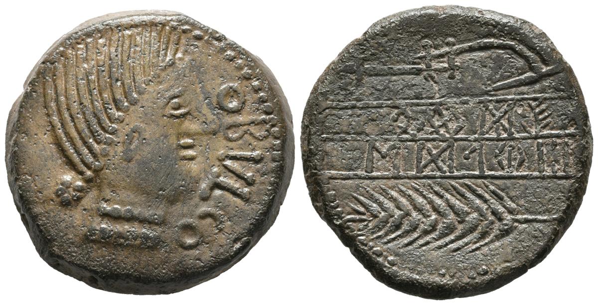 OBULCO (Porcuna, Jaén). As. (Ae. 18,81g/29mm). 220-20 a.C. (FAB-1793). Anv: Cabeza femenina a derecha, delante leyenda: OBVLCO. Rev: Arado a derecha, debajo espiga a izquierda, entre ellos leyenda en dos líneas: ToBoTuCi/BuTeLCoS. MBC+.