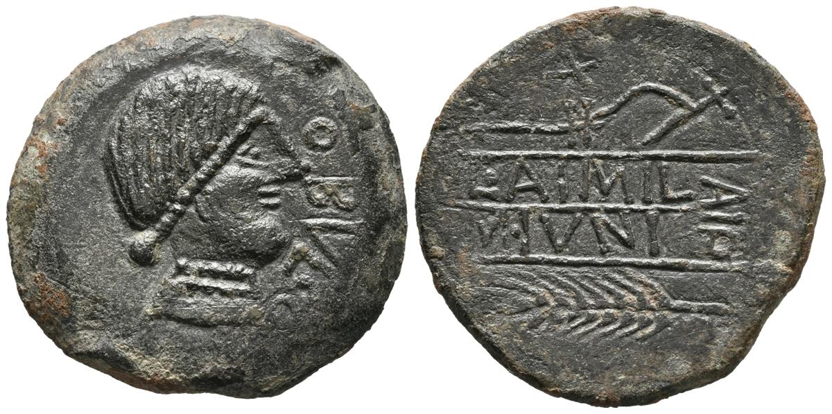 OBULCO (Porcuna, Jaén). As. (Ae. 17,55g/32mm). 220-20 a.C. (FAB-1808). Anv: Cabeza femenina a derecha, delante leyenda: OBVLCO. Rev: Arado a derecha, encima de él letra Ta, debajo espiga a izquierda, entre ellos leyenda: L AIMIL/M IVNI/AID. MBC+.