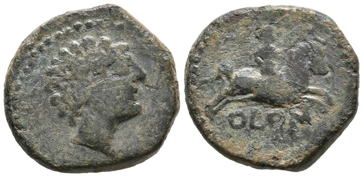 OLONT (Aznalcázar, Sevilla). As. (Ae. 12,41g/24mm). 50-20 a.C. (FAB-1876). Anv: Cabeza masculina a derecha. Rev: Jinete a derecha, debajo leyenda: OLONT. MBC.