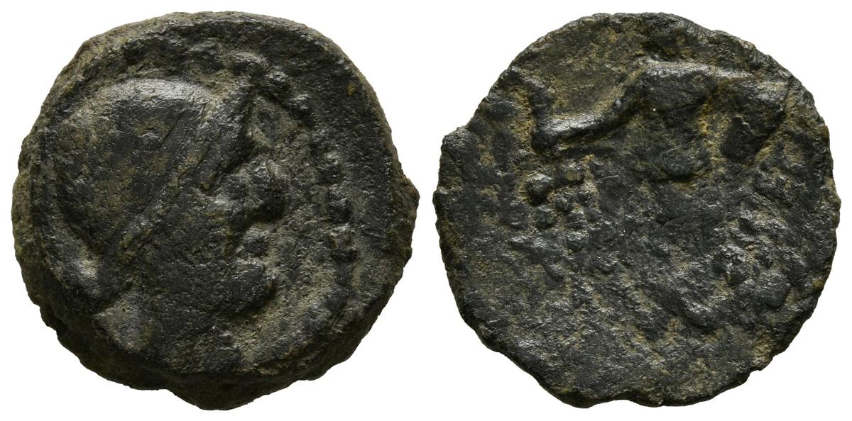 OSET (San Juan de Aznalfarache, Sevilla). Cuadrante. (Ae. 3,89g/17mm). 120-20 a.C. (FAB-1954 var). Anv: Cabeza con casco a derecha. Rev: Genio estante a izquierda portando racimo de uvas, detrás leyenda: OSSET. BC+.