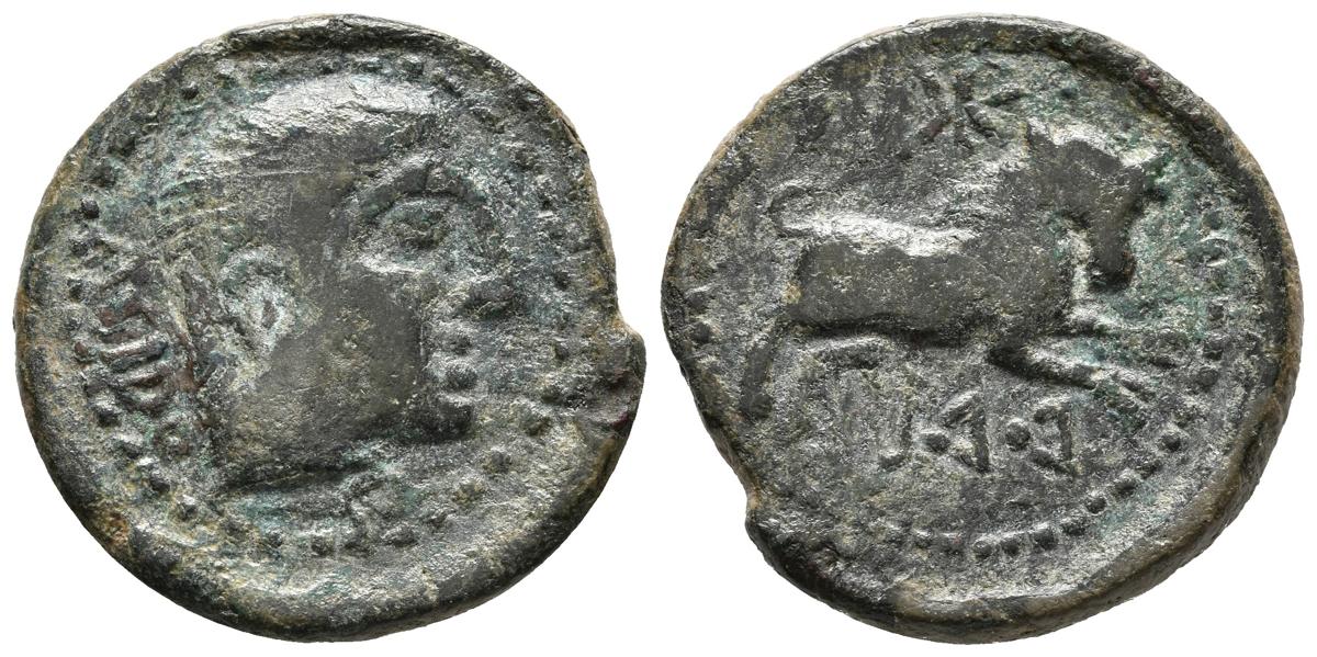 ASIDO (Medina Sidonia, Cádiz). Semis. (Ae. 8,05g/24mm). 50 a.C. (FAB-163). Anv: Cabeza masculina a derecha, detrás leyenda: ASIDO, debajo letra: S. Rev: Toro a derecha, encima y debajo leyenda libio-fenicia. MBC.