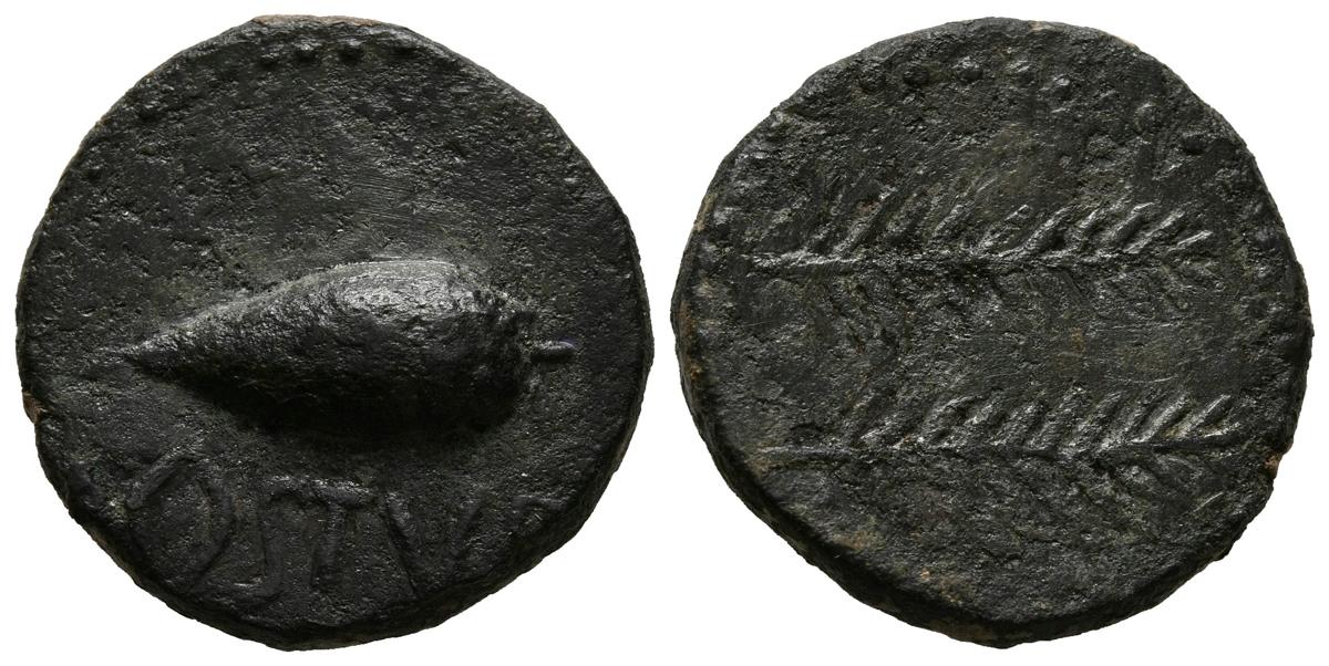 OSTUR (Zona de Carmona, Sevilla). Semis. (Ae. 7,25g/21mm). 150-50 a.C. (FAB-1976). Anv: Bellota a izquierda, debajo leyenda: OSTVR. Rev: Dos espigas a derecha. MBC.