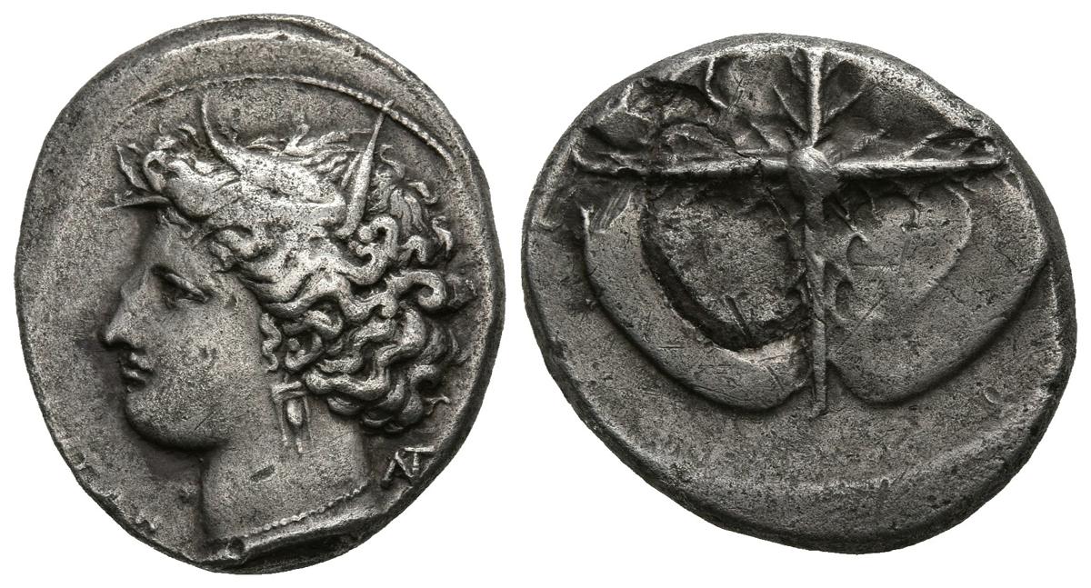 RODETON (Roses, Gerona). Dracma. (4,84g/20mm). 250-195 a.C. (FAB-2002). Anv: Cabeza femenina a izquierda, delante leyenda griega, detrás monograma NAT. Rev: Rosa vista por debajo. MBC. Descentrado. Muy rara.