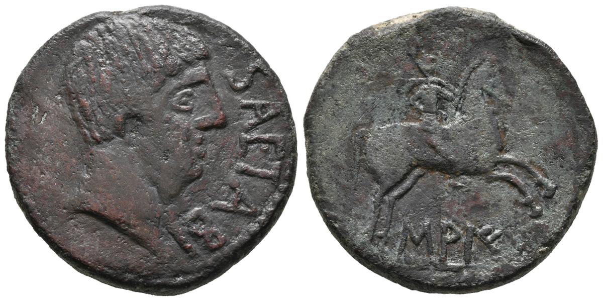 SAITI (Xátiva, Valencia). As. (Ae. 18,31g/29mm). 120-20 a.C. (FAB-2108). Anv: Cabeza masculina a derecha, delante leyenda: SAETABI. Rev: Jinete con palma a derecha, debajo leyenda ibérica sobre línea: SAITi. MBC.