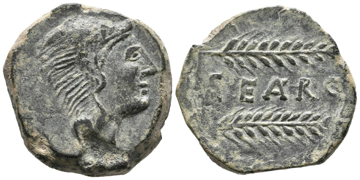 SEARO (Utrera, Sevilla). As. (Ae. 18,52g/28mm). 120-50 a.C. (FAB-2112). Anv: Cabeza de Hércules con piel de león a derecha. Rev: Dos espigas a derecha, entre ellas leyenda: SEARO. MBC+.