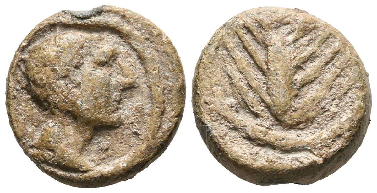 SEARO (Utrera, Sevilla). Plomo monetiforme. (Pb. 8,52g/17mm). 120-50 a.C. (CCP-1). Anv: Cabeza masculina a derecha. Rev: Espiga. MBC+.