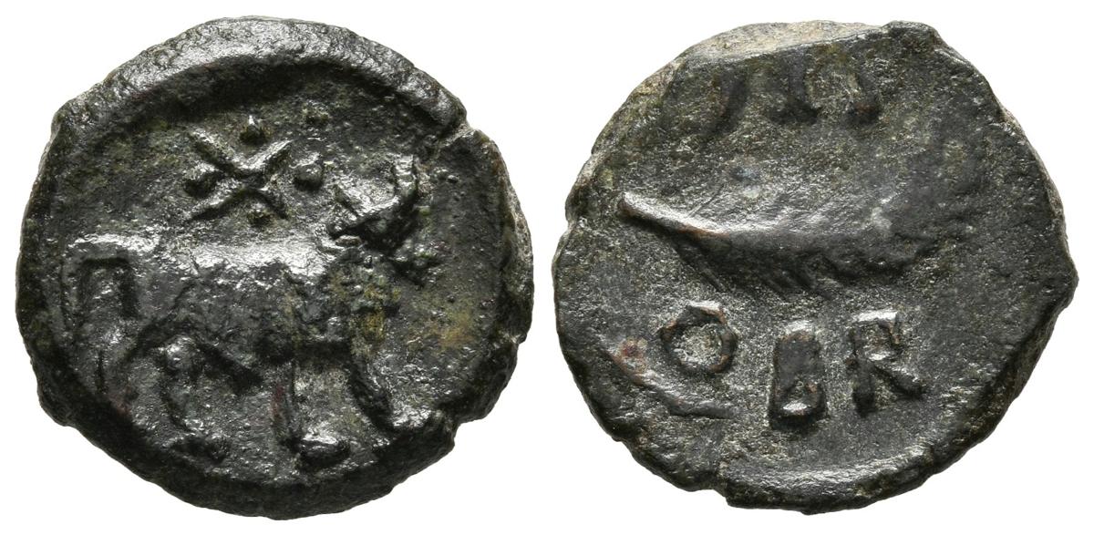 SEGOBRIGA (Saelices, Cuenca). Cuadrante. (Ae. 2,65g/16mm). 30-20 a.C. (FAB-2184). Anv: Toro a derecha, encima X entre tres puntos. Rev: Palma, alrededor leyenda: SECOBR. MBC+.