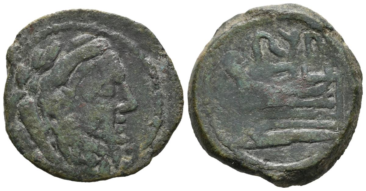 SEXI (Almuñécar, Granada). Calco. (Ae. 10,87g/27mm). 200-20 a.C. (FAB-2221). Anv: Cabeza de Hércules a derecha con piel de león. Rev: Proa, encima leyenda púnica tipo AA. MBC-. Escaso.