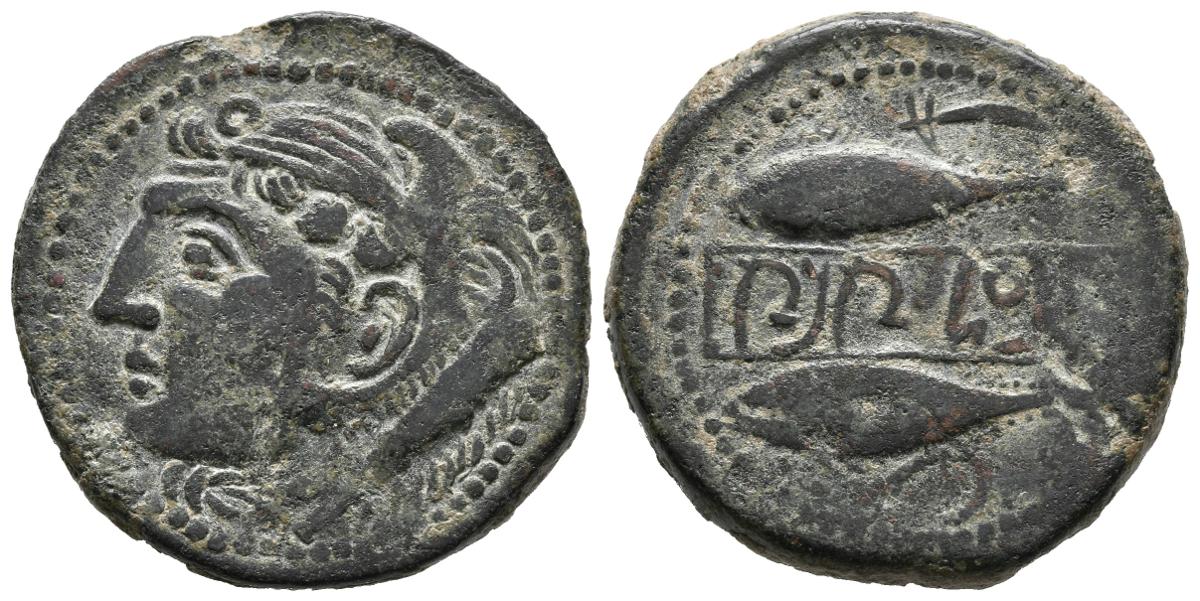 SEXI (Almuñécar, Granada). As. (Ae. 13,64g/26mm). 200-20 a.C. (FAB-2227). Anv: Cabeza de Hércules con piel de león a izquierda, detrás clava. Rev: Dos atunes a izquierda, encima letra Alef, debajo creciente con punto, entre ellos leyenda púnica tipo C. MBC.
