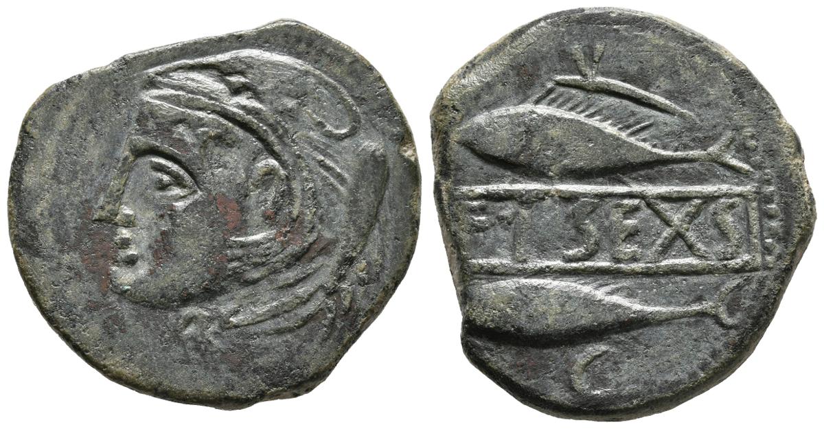 SEXI (Almuñécar, Granada). As. (Ae. 12,84g/27mm). 200-20 a.C. (FAB-2236 var). Anv: Cabeza de Hércules con piel de león a izquierda, detrás clava. Rev: Dos atunes a izquierda, debajo creciente, encima letra Alef, entre ellos cartela con leyenda: F I SEXI. MBC.