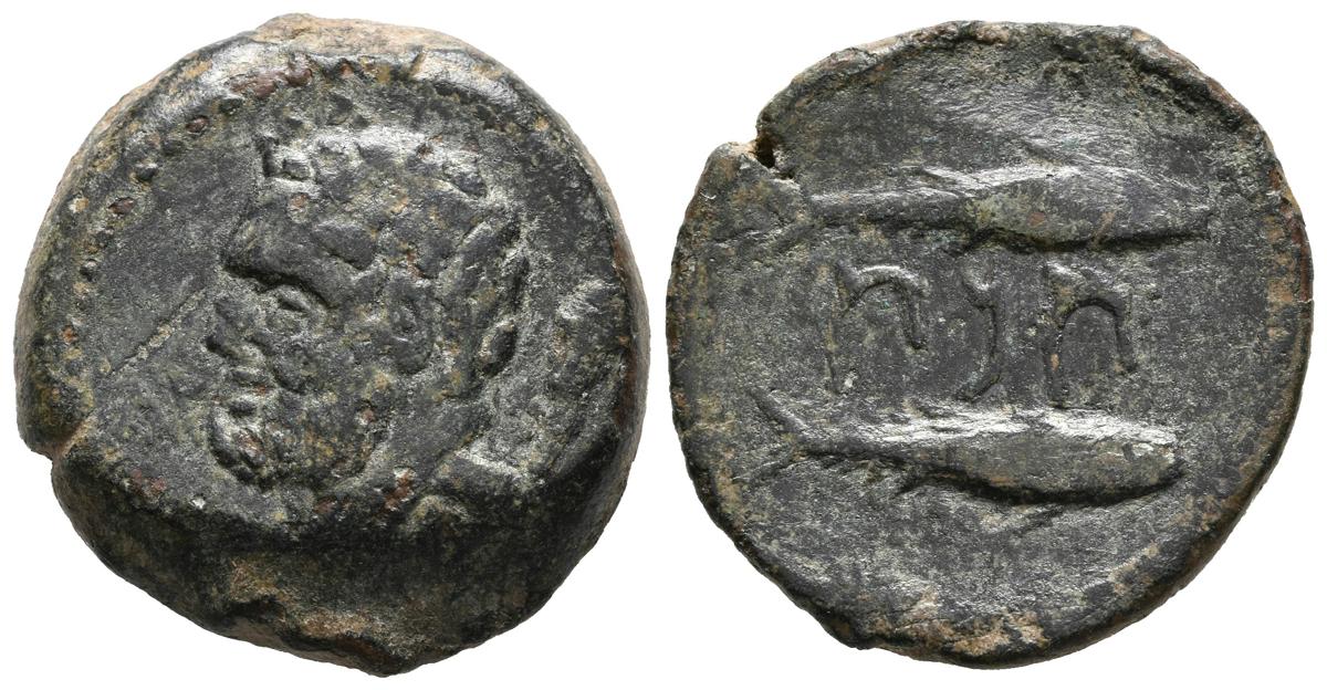 SEXI (Almuñécar, Granada). Semis. (Ae. 12,54g/25mm). 200-20 a.C. (FAB-2237). Anv: Cabeza barbada de Hércules a izquierda, detrás clava. Rev: Dos atunes a derecha, entre ellos leyenda púnica tipo AA. MBC. Escaso.